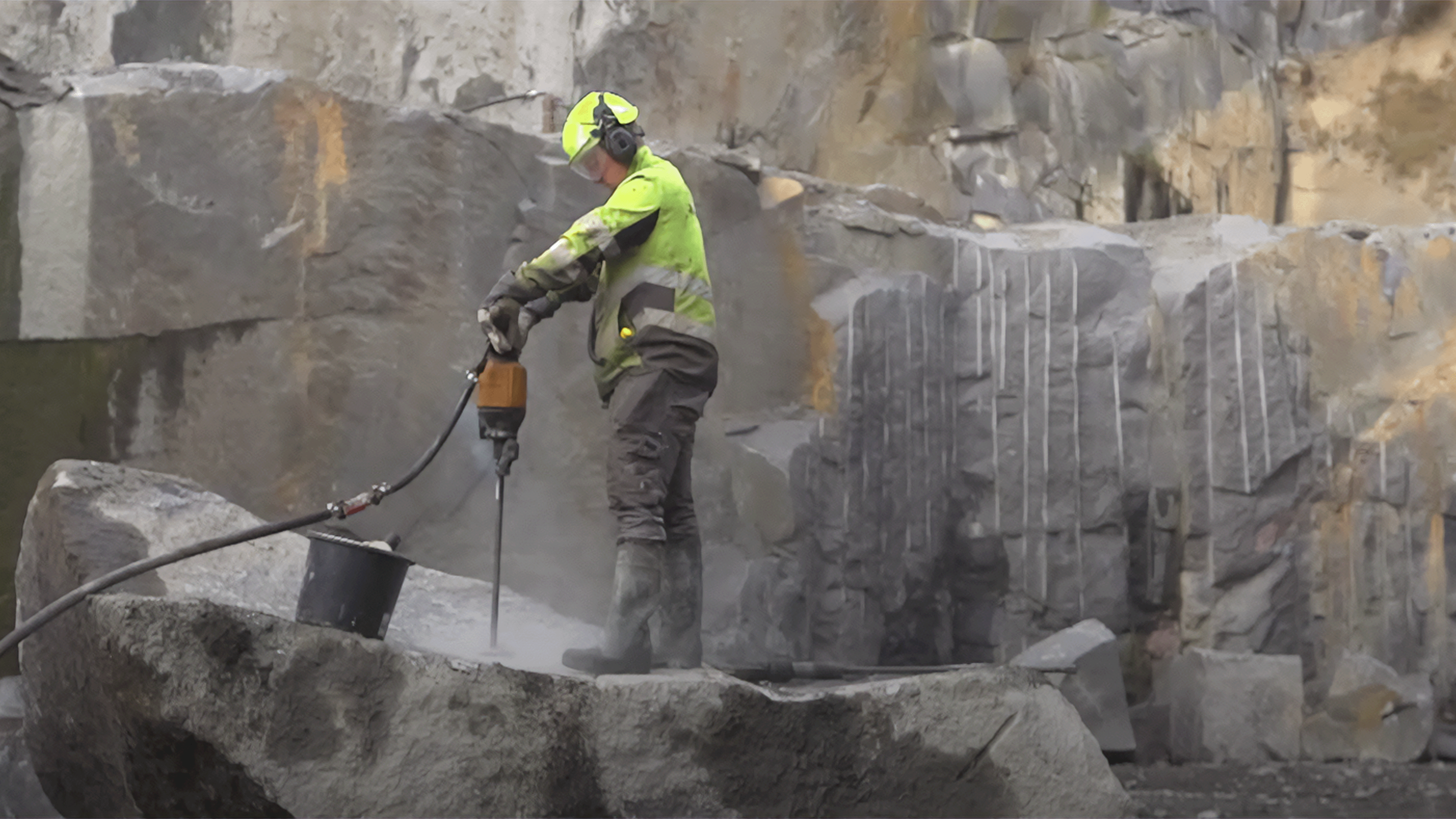 Arbejdet med at producere bornholmsk granit er både hårdt, støvende og støjende. Se med, når der gøres klar til sprængning, når granitten forarbejdes og hør personlige historier om valget og glæden ved at arbejde med granit på Bornholm.