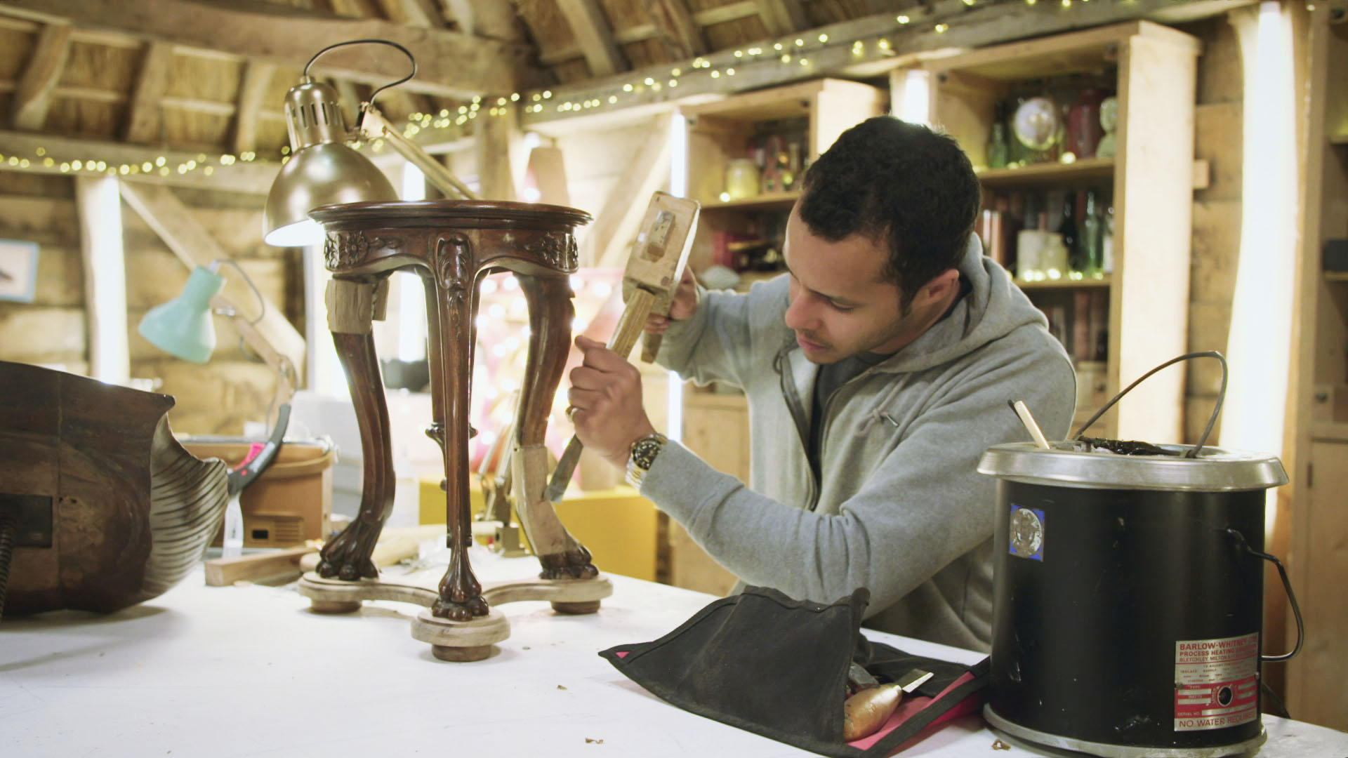 Et gammelt, slidt sofabord skal have en ordentlig tur for få sit fine look tilbage, og så kaster teamet sig over en mekanisk panda, der har over 60 år på bagen.