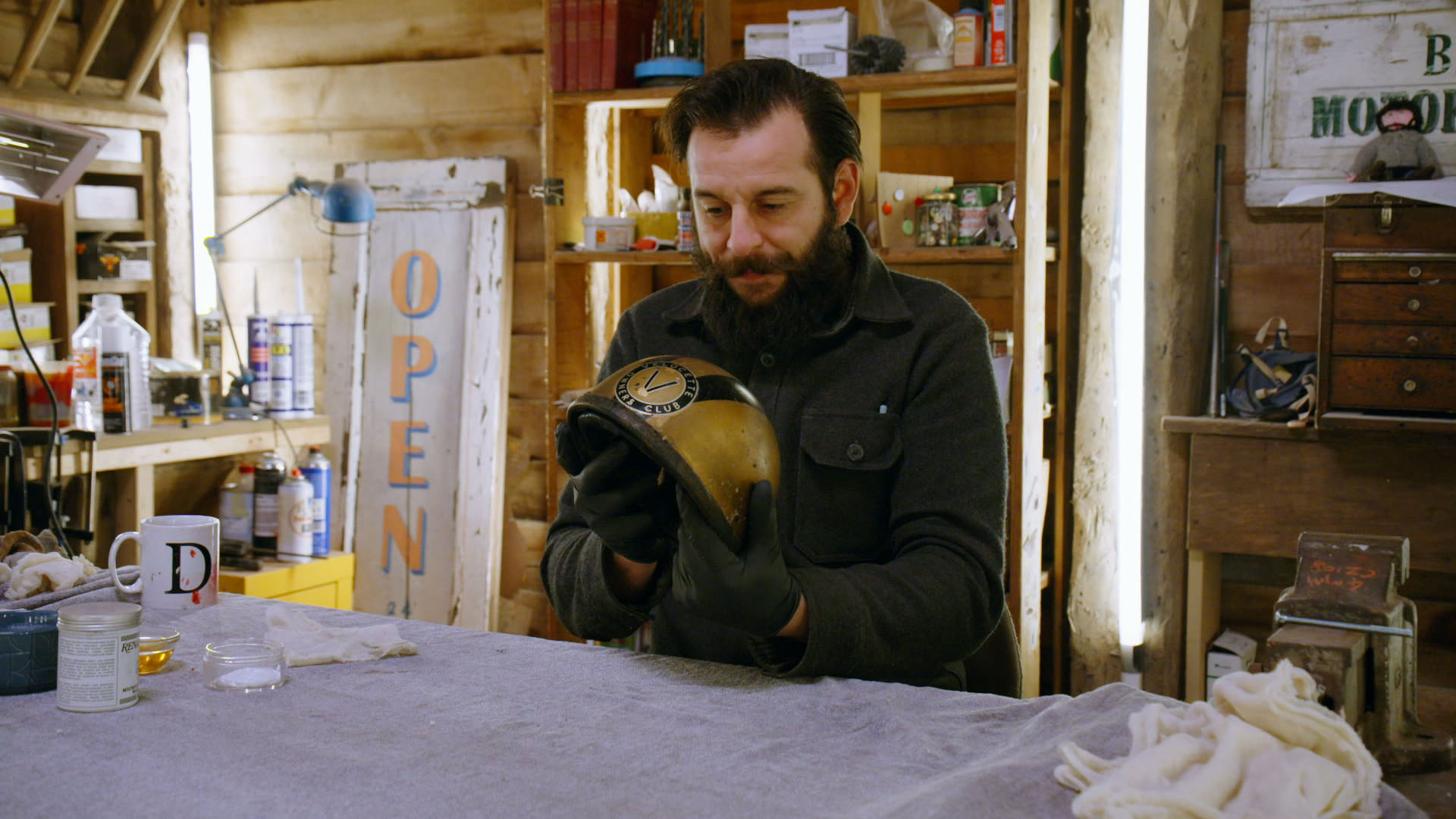 Værkstedsholdet restaurerer et par slidte ishockeyskøjter, en motorcykelhjelm, der har været jorden rundt, og en bjørn, der hedder Lummy.