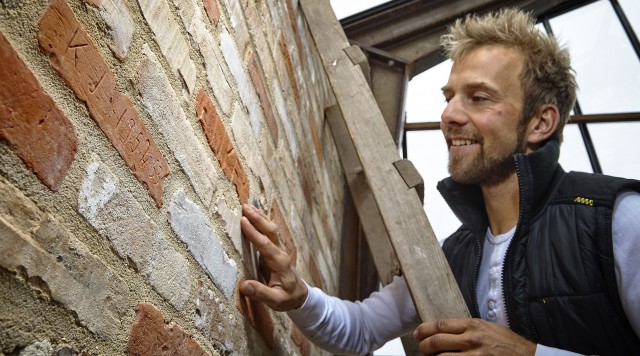 Søren Vester har med venner og families hjælp håndrenset og genbrugt 16.000 mursten fra den gamle konfirmandstue, og nu skal de mures op igen i 'driverhuset'. .
