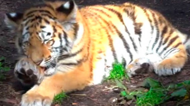 Den lille tigerunge i Københavns Zoologiske Have hygger sig hos sin mor, men den vokser sig hurtigt stor!